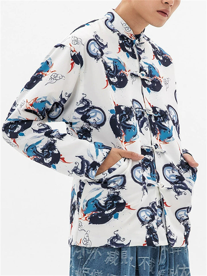 Men's Autumn Cartoon Loong Print Stand Collar Tangsuit Cardigan Jackets