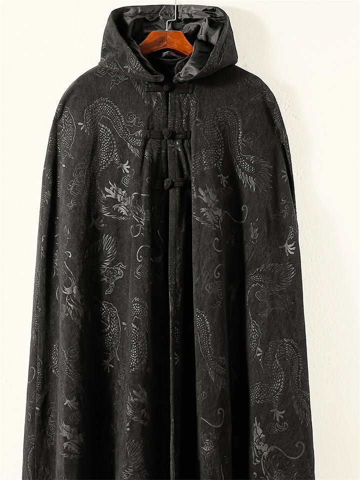 Men's Chinese Style Black Jacquard Corduroy Hooded Cloak Robe Jackets