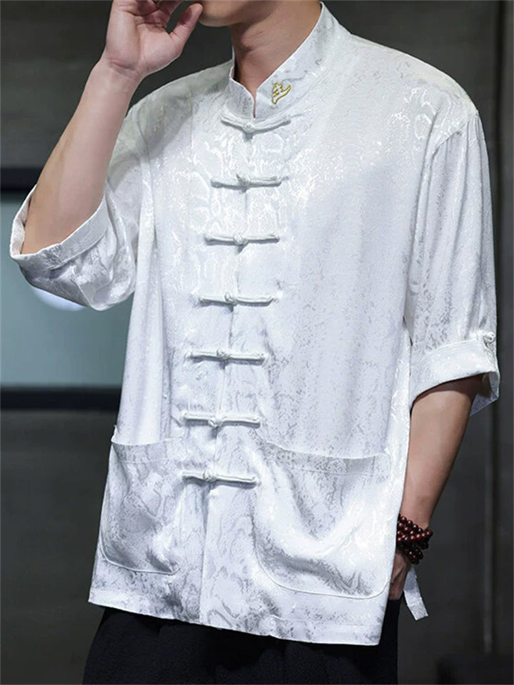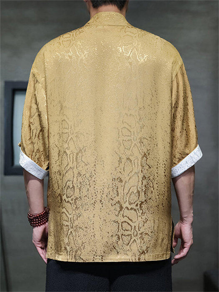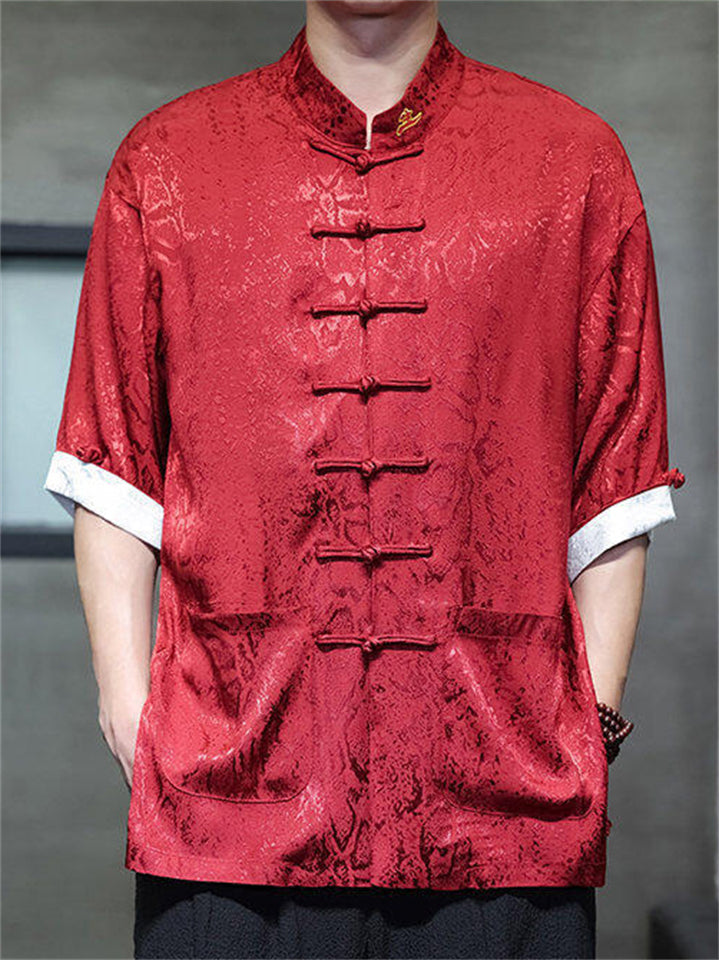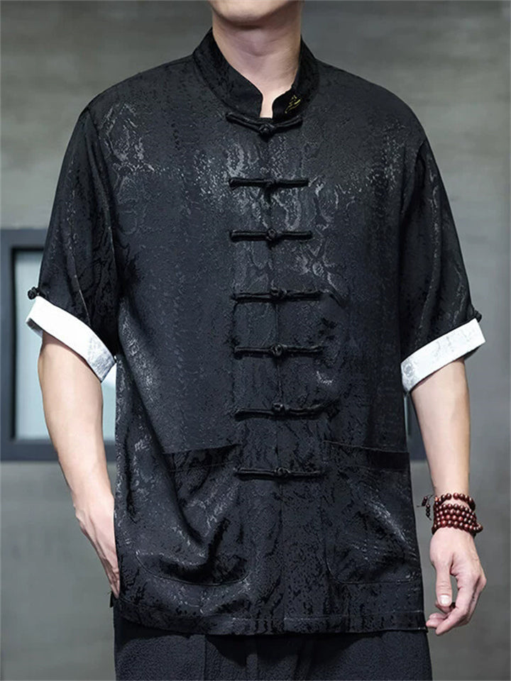 Men's Chinese Style Jacquard Short Sleeve Shirt with Stand Collar