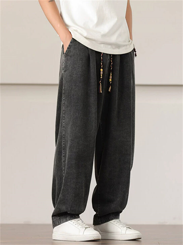 Men's Comfy Retro Trendy Solid Color Drawstring Wide Leg Denim Pants