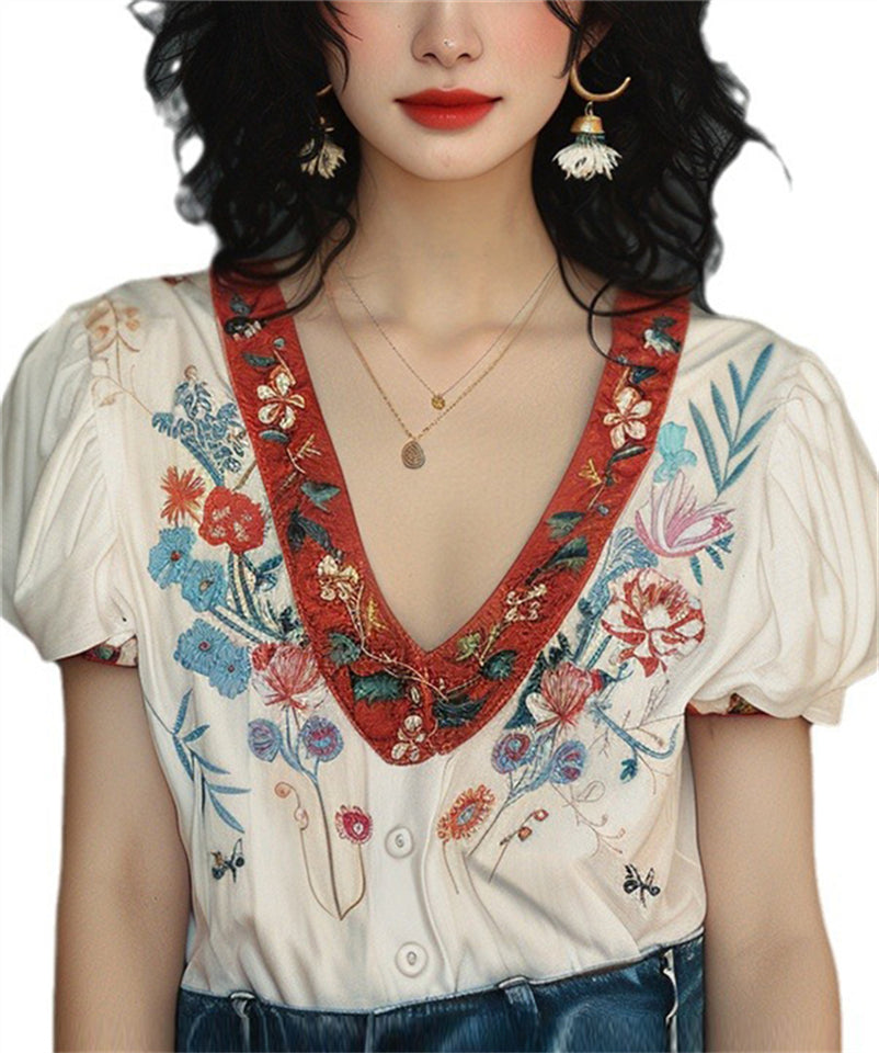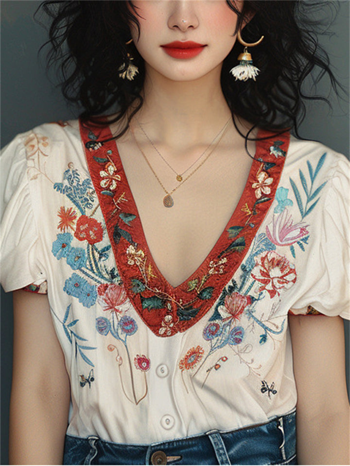 Women's V-Neck Floral Embroidery Puff Short Sleeve Shirt