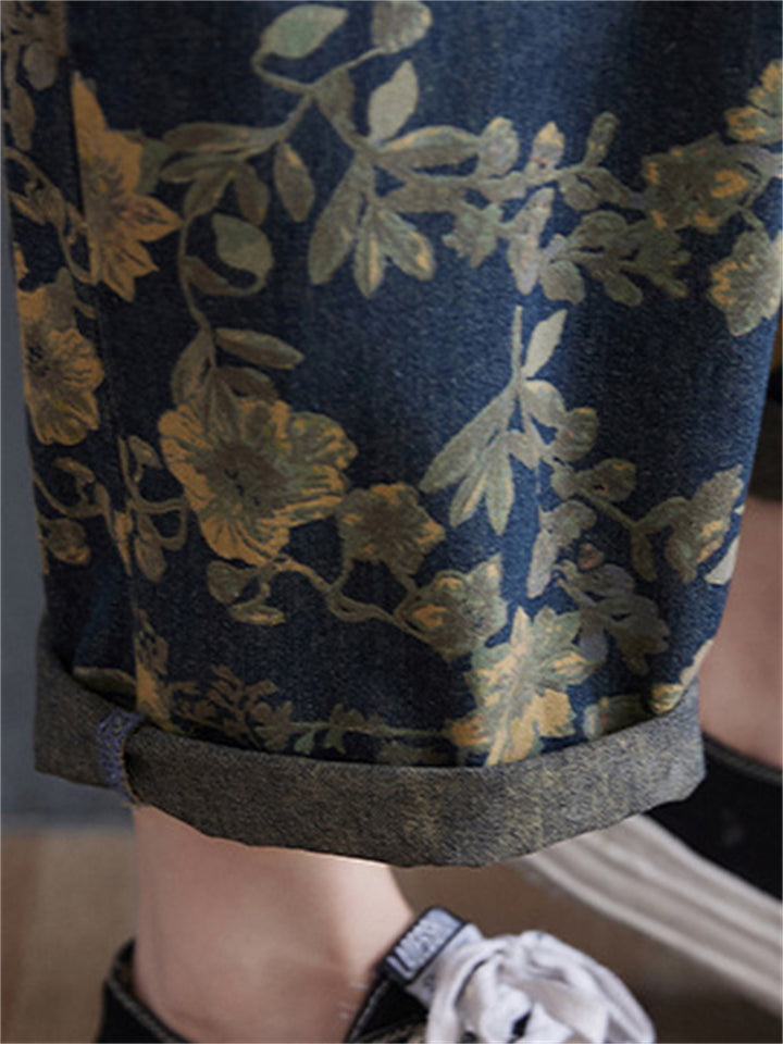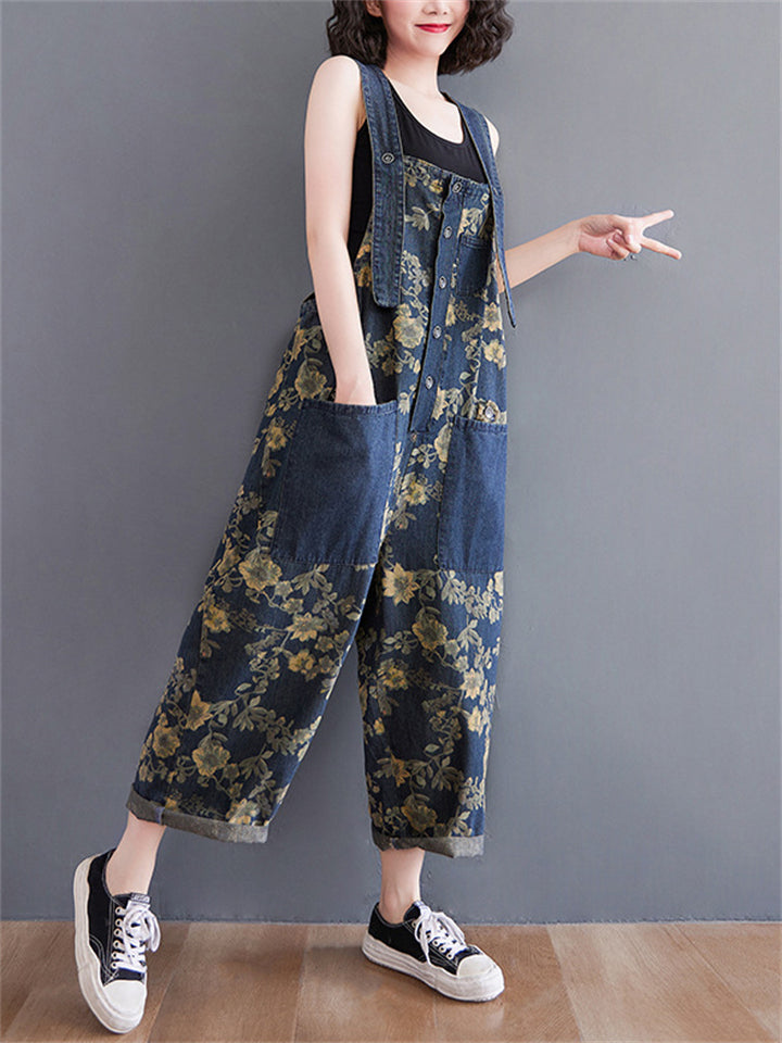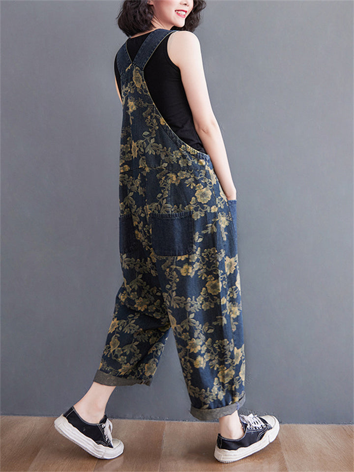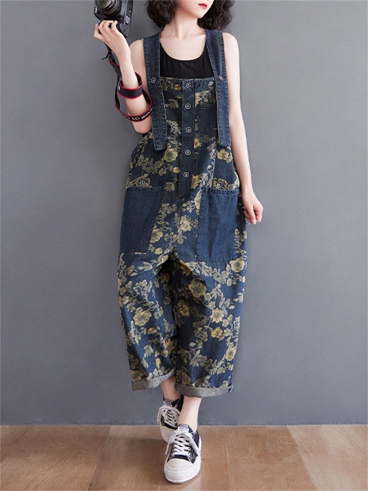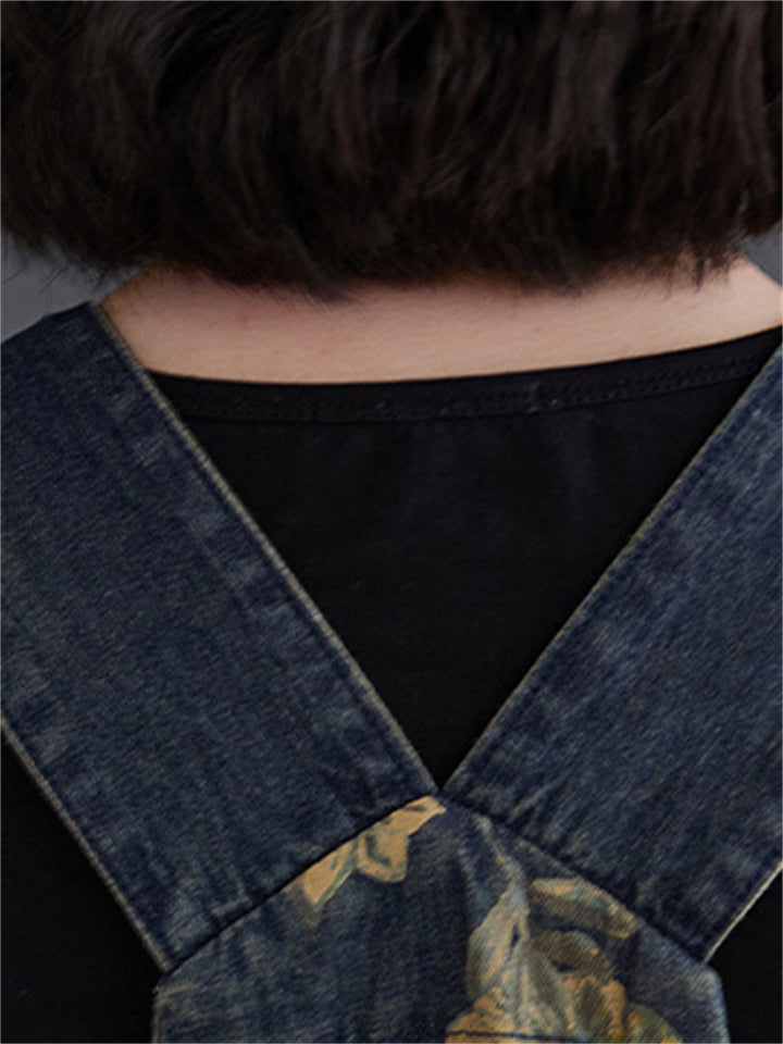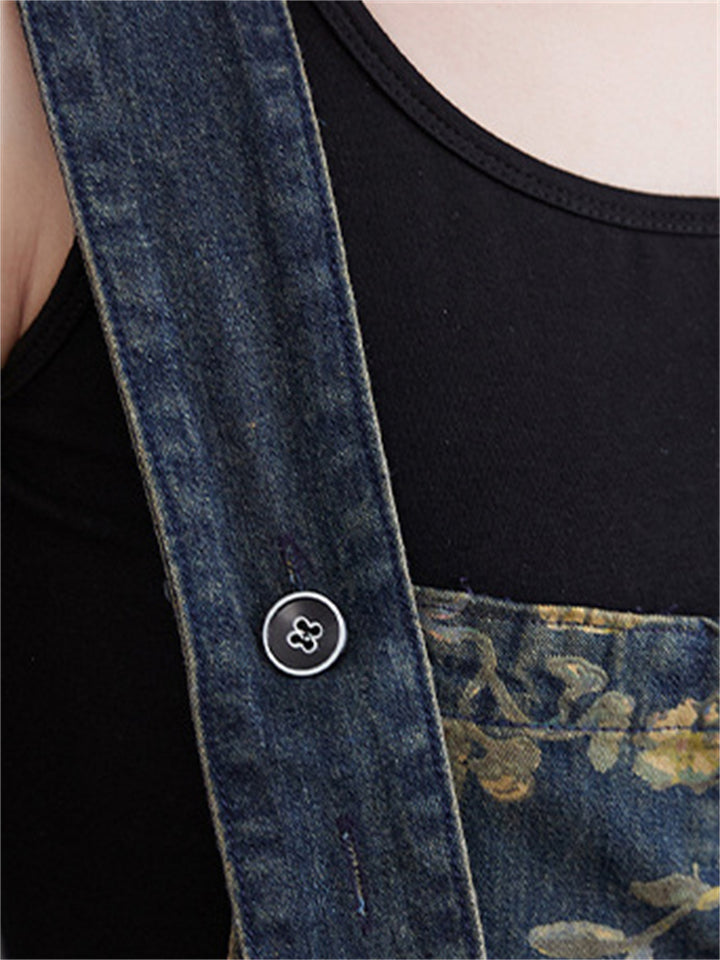 Yellow Flower Print Adjustable Strap Women's Denim Overalls